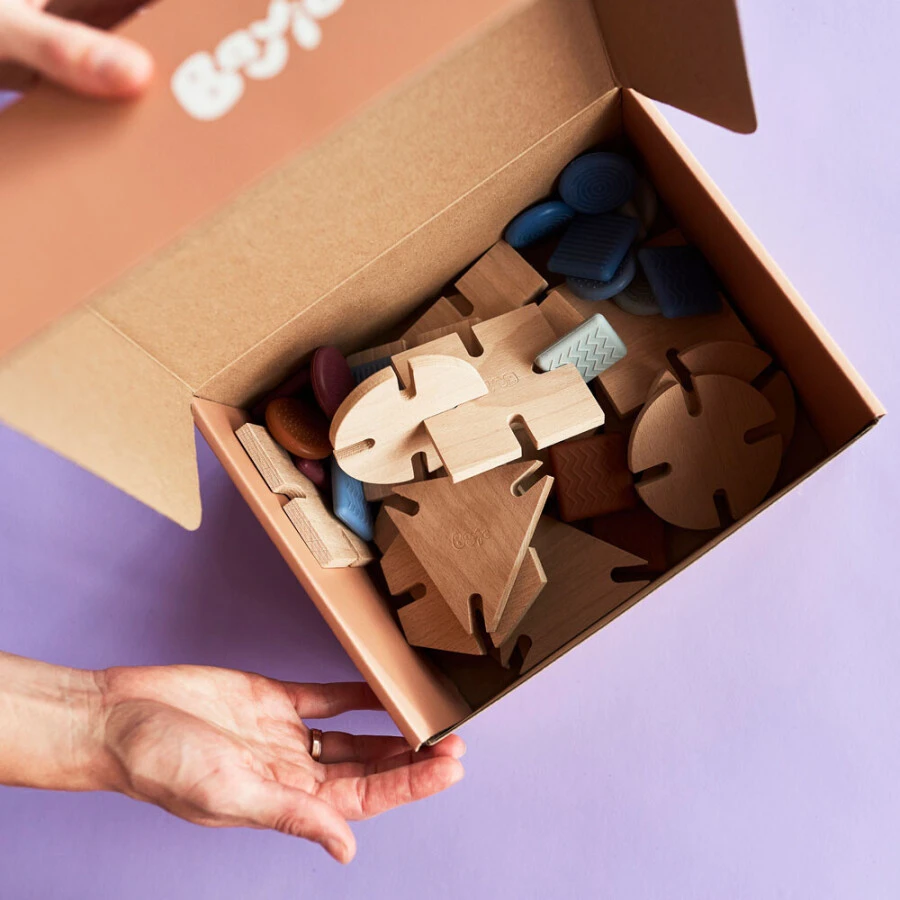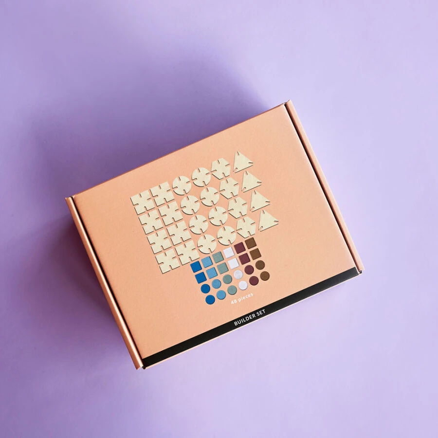 Deze duurzame constructiematerialen ‘Builder’ set bestaat uit 48 bouwstenen; 24 geometrische, houten basiselementen en 24 sensorische, siliconen verbindingselementen. De houten- en siliconenelementen zijn dankzij de inkepingen eenvoudig met elkaar te verbinden.