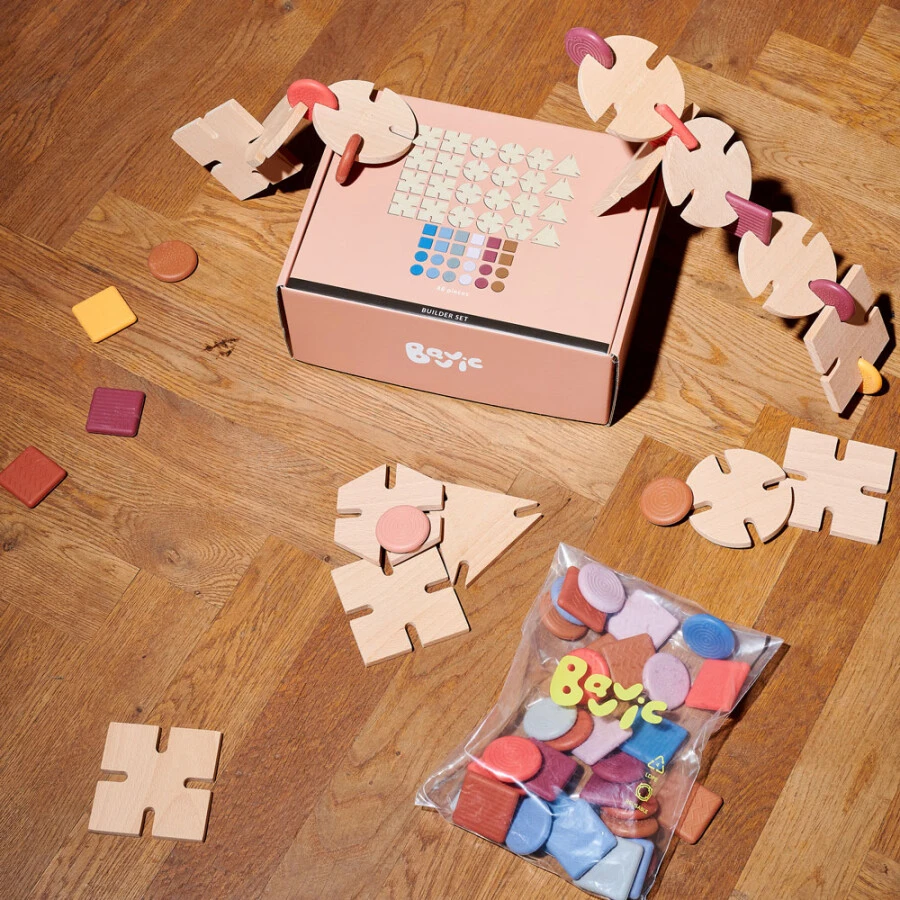 Een toren, een auto of een abstract kunstwerk; met de houten ‘Builder’ bouwset van BAVVIC zijn talloze unieke constructie sets te bouwen. Het open-einde materiaal laat kleine architecten en bouwers hun eigen fantasie volgen en ze kunnen hun mooiste creaties creëren.