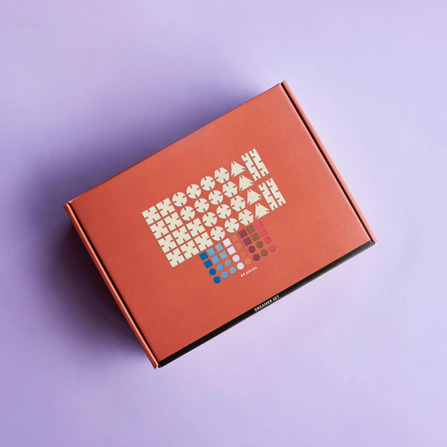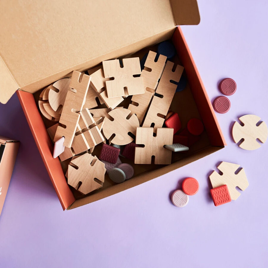 Deze duurzame constructiematerialen ‘Dreamer’ set bestaat uit 64 bouwstenen; 32 geometrische, houten basiselementen en 32 sensorische, siliconen verbindingselementen. De houten- en siliconenelementen zijn dankzij de inkepingen eenvoudig met elkaar te verbinden.