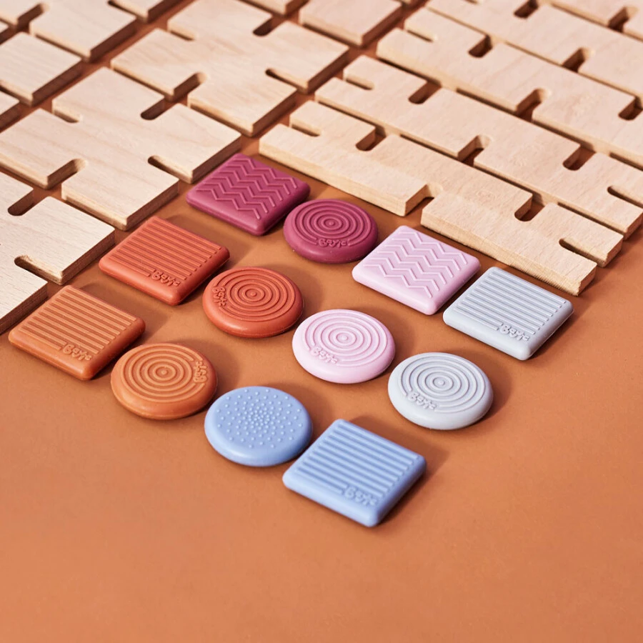 Deze duurzame constructiematerialen ‘Team’ set bestaat uit 256 bouwstenen; 96 geometrische, houten basiselementen en 160 sensorische, siliconen verbindingselementen. De houten- en siliconenelementen zijn dankzij de inkepingen eenvoudig met elkaar te verbinden.