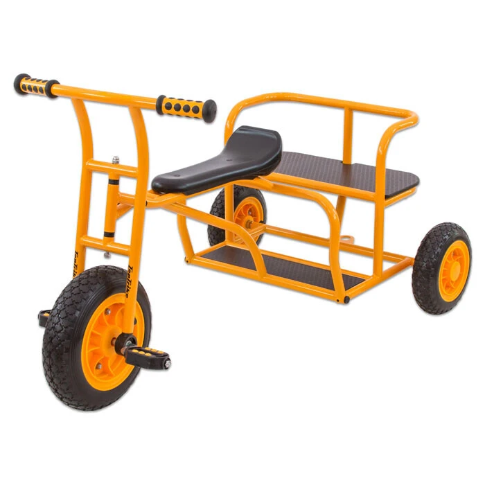 Samen is het veel leuker. Maximaal 3 kinderen kunnen samen met deze dubbele taxi buiten het speelplein verkennen en mooie ritjes maken. Het besturen van het voertuig versterkt de beenspieren. De passagiers worden aangemoedigd om stil te zitten en realiseren zich snel dat dit het trappen voor de bestuurder vergemakkelijkt. Zo wordt communicatie en empathie getraind. Beide passagiers kunnen zich aan de armleuningen vasthouden en comfortabel met hun voeten op de treeplank staan.