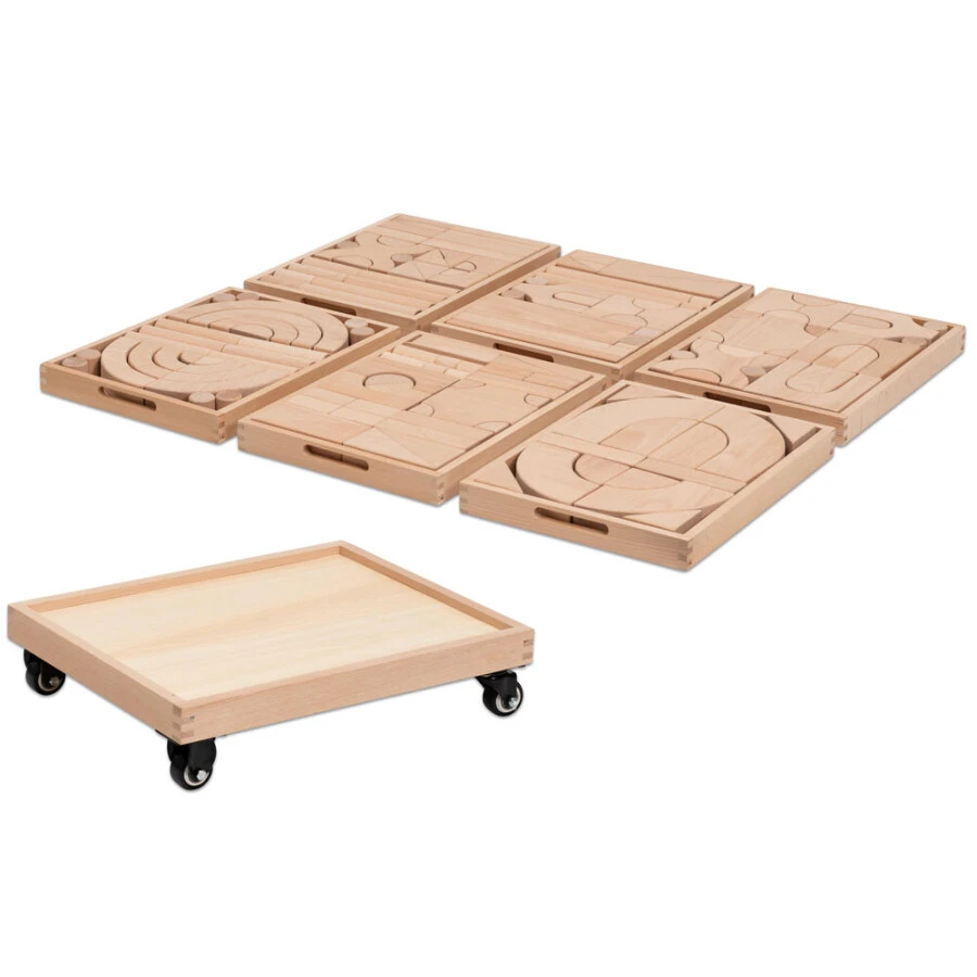 Deze blokkentrolley, inclusief de vele verschillende bouwblokken van massief beukenhout, is onmisbaar in elke bouwhoek. Beukenhout is enorm slijtvast, duurzaam en dus gemaakt voor jarenlang speelplezier in elk klaslokaal of speelruimte. Voor eenvoudig transport zijn 4 zwenkwielen bevestigd – zo kunnen de 6 vakken vol bouwblokken ook zonder meer in andere ruimtes worden gebruikt. Het materiaal van deze nieuwe blokkentrolley is genoeg om uw hele groep creatief bezig te houden.