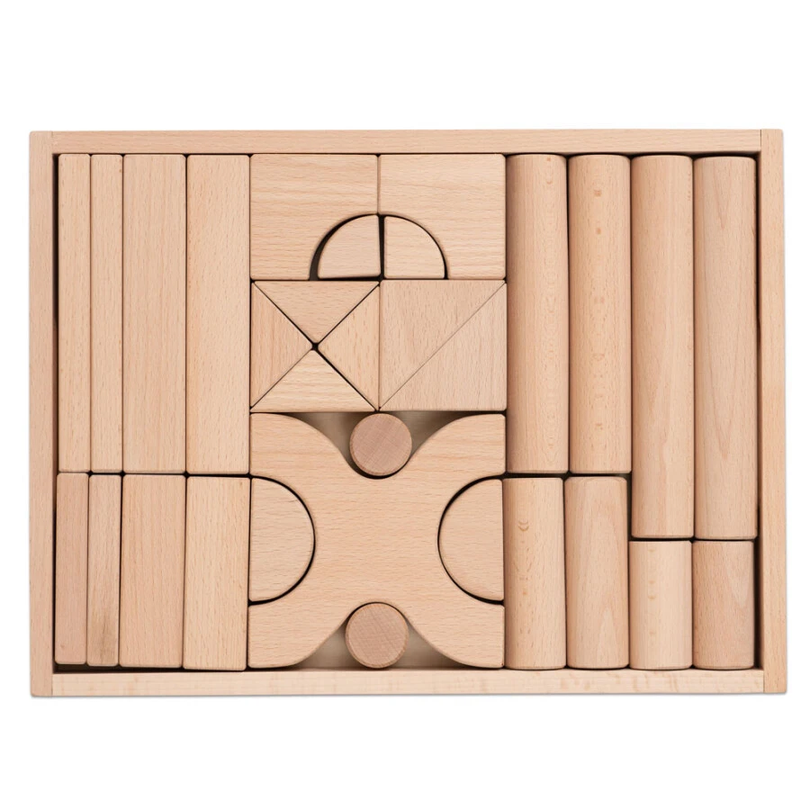 - Een bouwblokken set met bijzondere houten blokken (bogen, half ronde bouwblokken, verlengde houten blokken etc.)