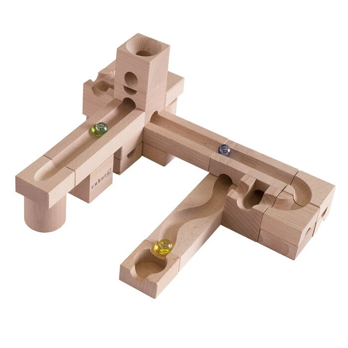 Inhoud: 17 onbehandelde beukenhouten kubusblokken met verschillende functies en 6 knikkers.