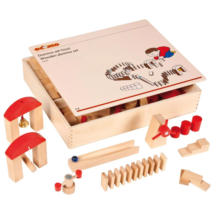 Met deze Domino bouwset kan een kind naar hartelust experimenteren met het domino effect. Naast de traditionele dominostenen bevat de set trapjes, draaideuren, belletjes, een molentje en andere onderdelen die voor leuke special effects kunnen zorgen. Hierdoor is de set geschikt voor jong en oud maar ook zeker voor het kind dat wat extra uitdaging kan gebruiken. Naast het oefenen van de motorische vaardigheden kan het kind met deze set leren samenwerken en zijn creatieve geest stimuleren.