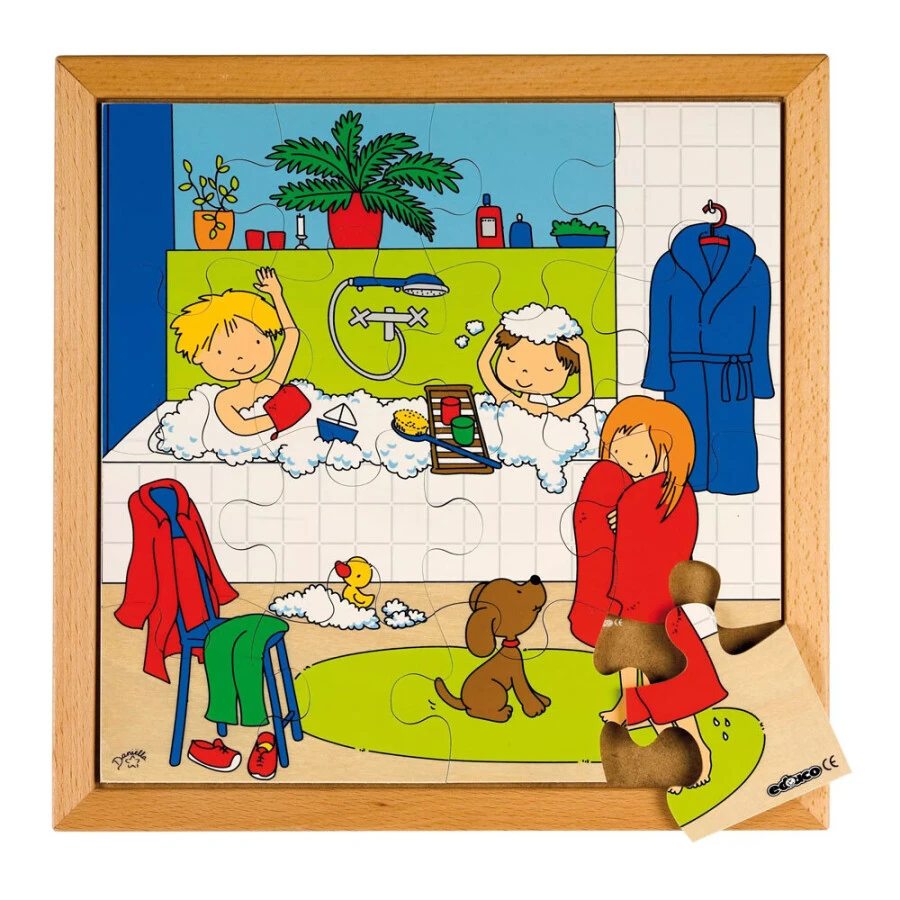 Naast veel puzzelplezier biedt deze puzzel ook veel mogelijkheden om de woordenschat te ontplooien. Deze puzzel is onderdeel van een serie puzzels met de thema’s aankleden, handen wassen, tanden poetsen en in bad.