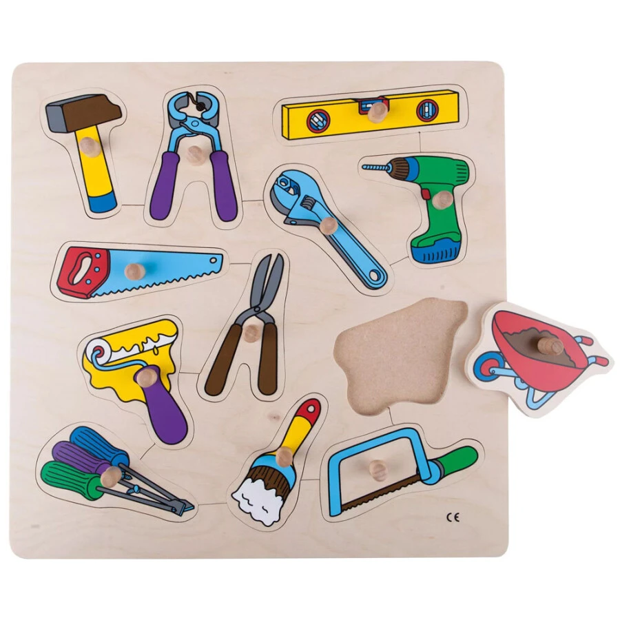 Door te spelen met deze inlegpuzzel leren kinderen verschillende soorten gereedschap te benoemen. Deze inlegpuzzel stimuleert de visuele waarneming. Door de knoppen op de puzzelstukken zijn deze makkelijk vast te houden.