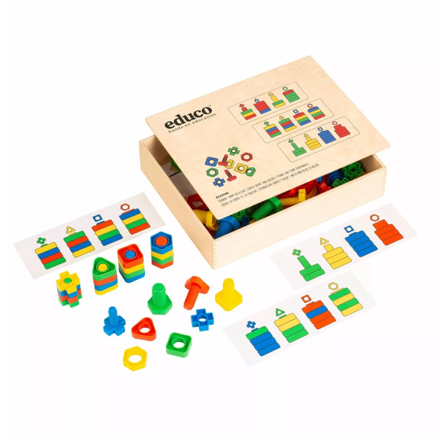 Zo worden zowel de vormen als de kleuren op een speelse manier geoefend. Het draaien van de moeren bevordert de motoriek.