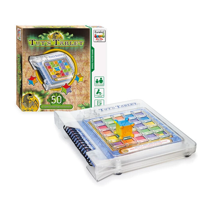 Tut’s Tablet is een geweldige breinbreker waarin je met een kleurrijke kubus je een weg uit het doolhof moet zien te vinden. Kies een opdracht uit het boekje en schuif deze in de gleuf van het spelbord. Plaats vervolgens de kubus op het spelbord zoals afgebeeld op de opdrachtkaart en probeer al rollend het einde te bereiken. Met elke beweging moet de kleur van de bovenzijde van de kubus overeenkomen met het betreffende vak van de opdrachtkaart. Je hebt de juiste oplossing gevonden wanneer ook op het laatste vak van de opdrachtkaart de kleuren met elkaar overeenkomen. Tut’s Tablet bevat maar liefst 50 uitdagingen, verdeeld in 4 moeilijkheidsniveaus, waardoor je nog lang bezig zal zijn om alle oplossingen te vinden. Kom je er toch niet uit? Dan vind je de oplossing(en) in het boekje, of leg je het spel even opzij om op een later tijdstip met de opdracht verder te gaan. Ga jij de uitdaging aan?