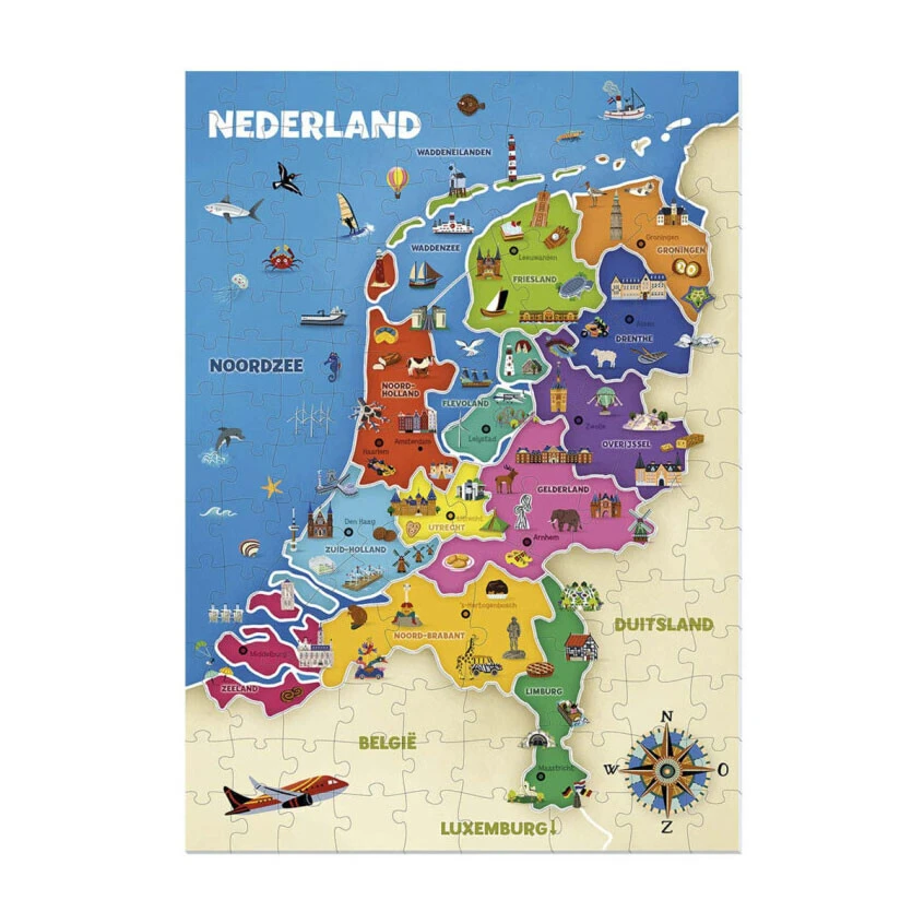 Educatieve puzzel waarmee kinderen op een leuke manier leren over de Nederlandse aardrijkskunde en enkele van haar karakteristieke en culturele elementen.