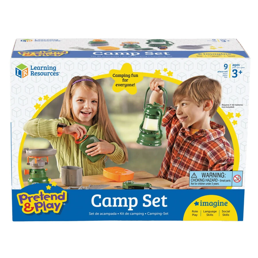 Verhalen vertellen bij het kampvuur en rollenspel spelen op de camping. Kinderen houden van kamperen dus laat ze overal hun denkbeeldige camping opzetten met deze 9-delige set! Inclusief unieke verlichte lantaarn en fornuis (elk vereist 2 AA-batterijen, niet inbegrepen) en andere kampeergereedschappen die nodig zijn om te overleven in de zogenaamde wildernis!