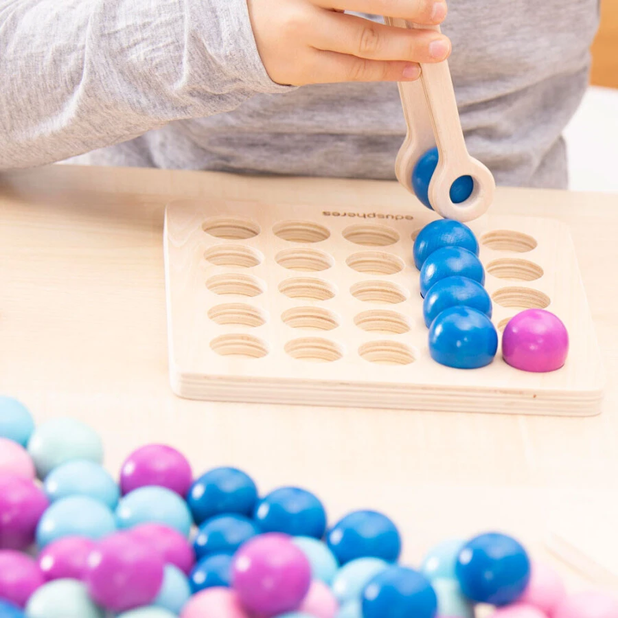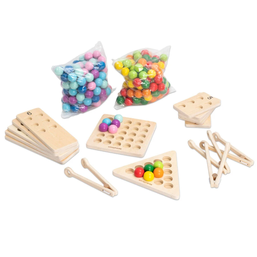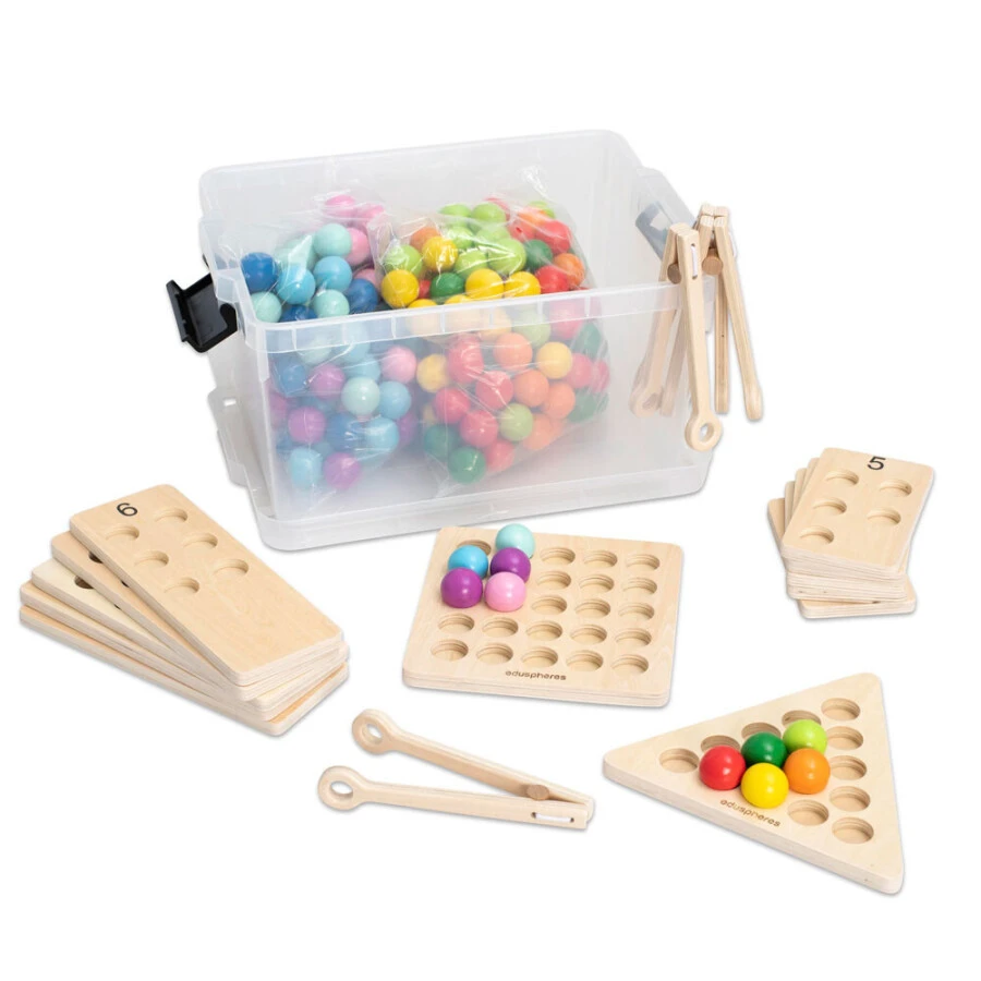 Kinderen vanaf 3 jaar trainen intensief hun fijne motoriek door de ballen vast te pakken met de houten pincet. Ze plaatsen de ballen op de bijpassende telborden. Zo wordt hun getalbegrip in het getallengebied tot 10 bevorderd. De kinderen leren getallen en tellen op een speelse manier. Van de kleurrijke houten ballen kan ook een piramide of een vierkant worden gemaakt. De ballen in 10 kleuren nodigen de kinderen uit tot sorteren en groeperen.