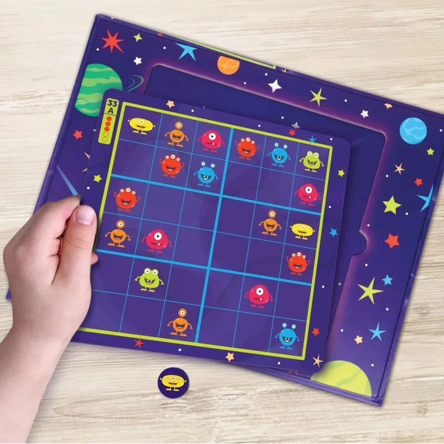 Los de 72 leuke ruimte Sudoku-spelletjes voor kinderen op met deze magnetische set die perfect is voor het spelenderwijs ontwikkelen van vroege vaardigheden op het gebied van wiskunde, logica en kritisch denken. Dankzij het magnetische spelbord en de speelstukken kunnen kinderen de puzzels oplossen in de auto, aan de keukentafel en overal daartussenin! De puzzels worden steeds moeilijker, wat betekent dat kinderen kunnen blijven spelen terwijl ze groeien en leren.