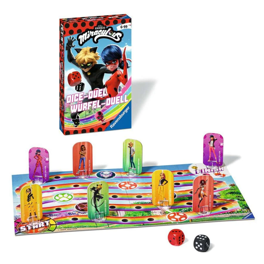 Help de superhelden Ladybug en Cat Noir! Versla de schurken in een dobbel-duel en ga snel naar het doel bij de Kwami’s. Met dobbelgeluk en tactiek kunnen de spelers het doel bereiken. Een spannend dobbelspel van Ravensburger.