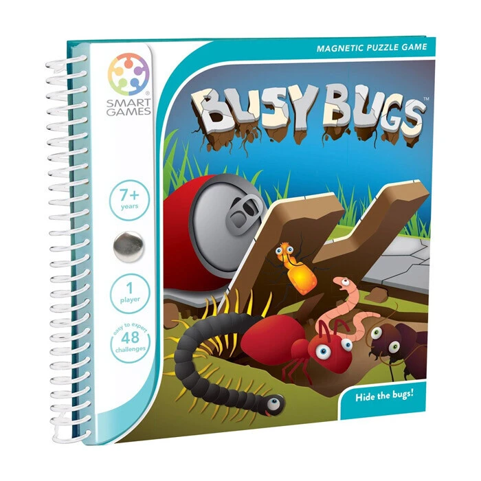 De opdrachten van Busy Bugs zitten in het boekje en de rechterzijde is het spelbord. De vier puzzelstukken zijn magnetisch en zo wordt Busy Bugs een ideaal reisspel.
