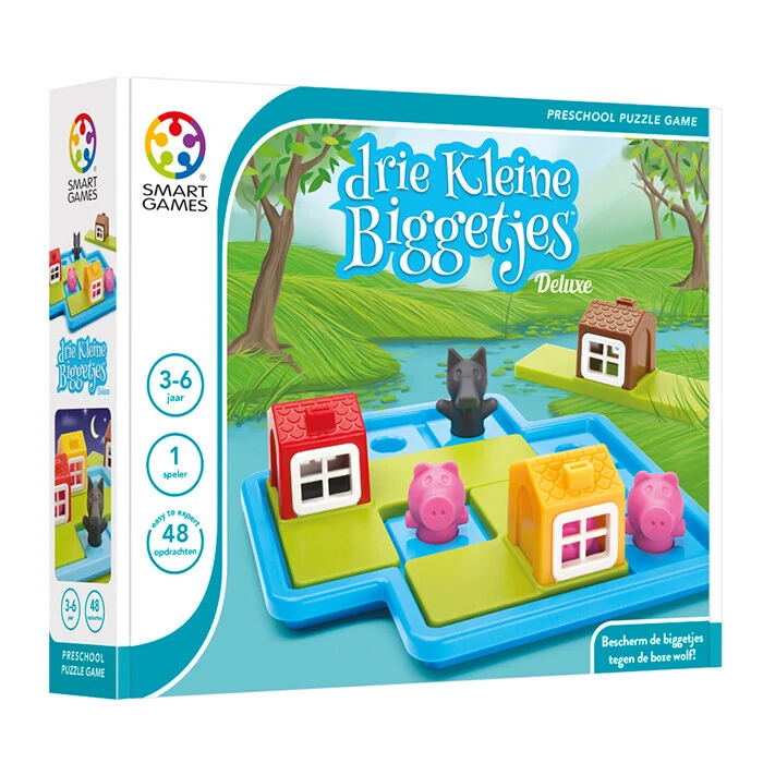 Drie Kleine Biggetjes is een superleuk denkspel speciaal ontwikkeld voor de handjes van jonge kinderen. Met de drie grote puzzelstukken zorgt het kind ervoor dat de biggetjes veilig in hun huisjes zitten wanneer de grote wolf dichtbij is. Drie Kleine Biggetjes bevat maar liefst 48 opdrachten en een leuk plaatjesboek met een verhaal. De opdrachten zijn verdeeld in 24 dag-opdrachten waar de wolf niet aanwezig is en 24 nacht-opdrachten met de wolf. Het kind zal veel plezier beleven aan dit leuke denkspel van Smart Games!