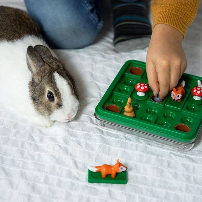 Een heel leuk nieuw spel in de serie compact spellen van SmartGames. Kies een opdracht en plaats de konijnen, vossen en paddenstoelen volgens de opdracht. De bedoeling is om alle konijnen veilig in hun holletje te krijgen. Door het verschuiven van de vossen kunnen de konijnen over de vossen en paddenstoelen springen. Het is aan jou om de juiste volgorde te bepalen!