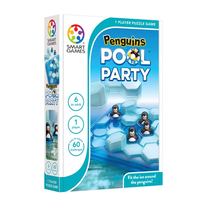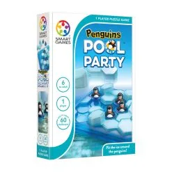Penguins Pool Party bevat een spelbord, 4 ijsschotsen, 4 penguins en een apart boekje met speluitleg, 60 opdrachten en de oplossingen.