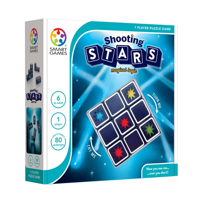 Ben jij een ster in logisch denken? Probeer dan de 80 opdrachten van Shooting Stars en laat je hersenen kraken. In dit spel kies je een opdracht waarna je de gegeven illustratie met de speelstukken probeert na te bouwen. Er zal flink gepuzzeld moeten worden, bij het omdraaien van de blokjes veranderen de sterren namelijk van kleur en kan er ook ongewenst een vallende ster verschijnen. De 80 uitdagingen van Shooting Stars zijn verdeeld in verschillende moeilijkheidsgraden van eenvoudig tot heel ingewikkeld, waardoor deze breinbreker geschikt is voor jong en oud.