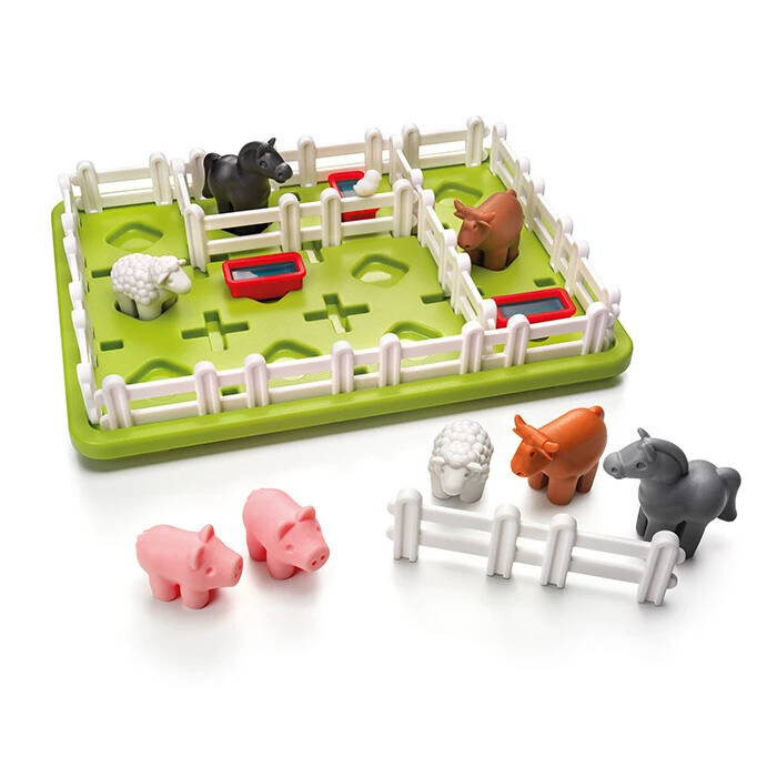 Inhoud: Spelbord met 4 vaste hekken, 2 paarden, 2 koeien, 2 schapen, 2 varkens, 3 water troggen, 3 hekken, boekje met 60 opdrachten en oplossingen.