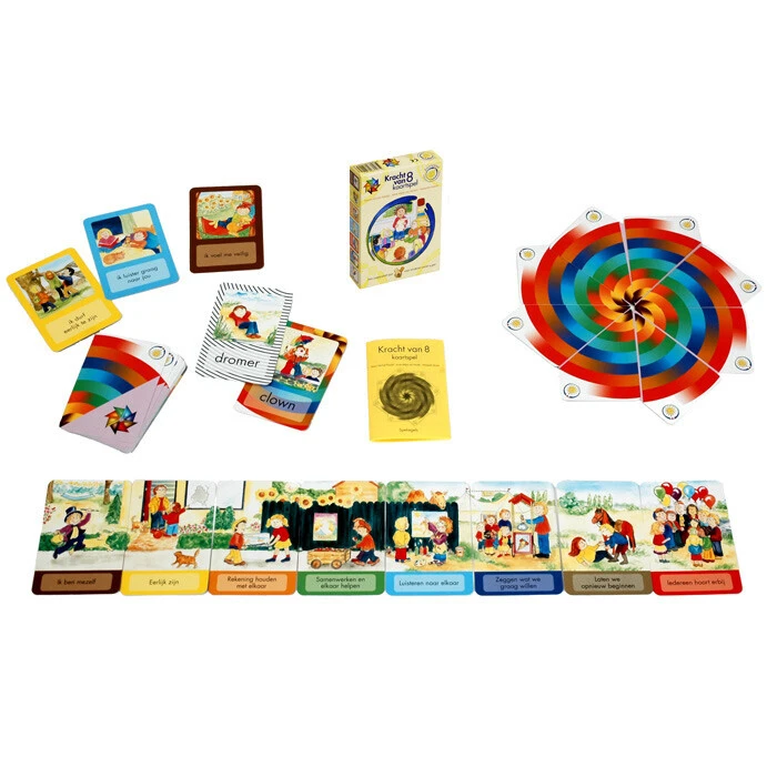 Het Kracht van 8 kaartspel is thuis, op de basisschool en bij individuele begeleiding van kinderen te gebruiken. Het kaartspel draagt bij aan een positieve manier van met elkaar omgaan. Alle spellen kunnen met een groepje kinderen gespeeld worden; een deel ook met z’n tweeën of zelfs alleen. Een krachtkaart trekken kan ook: de kaart dient dan als steuntje in de rug of als speels begin van een gesprek.