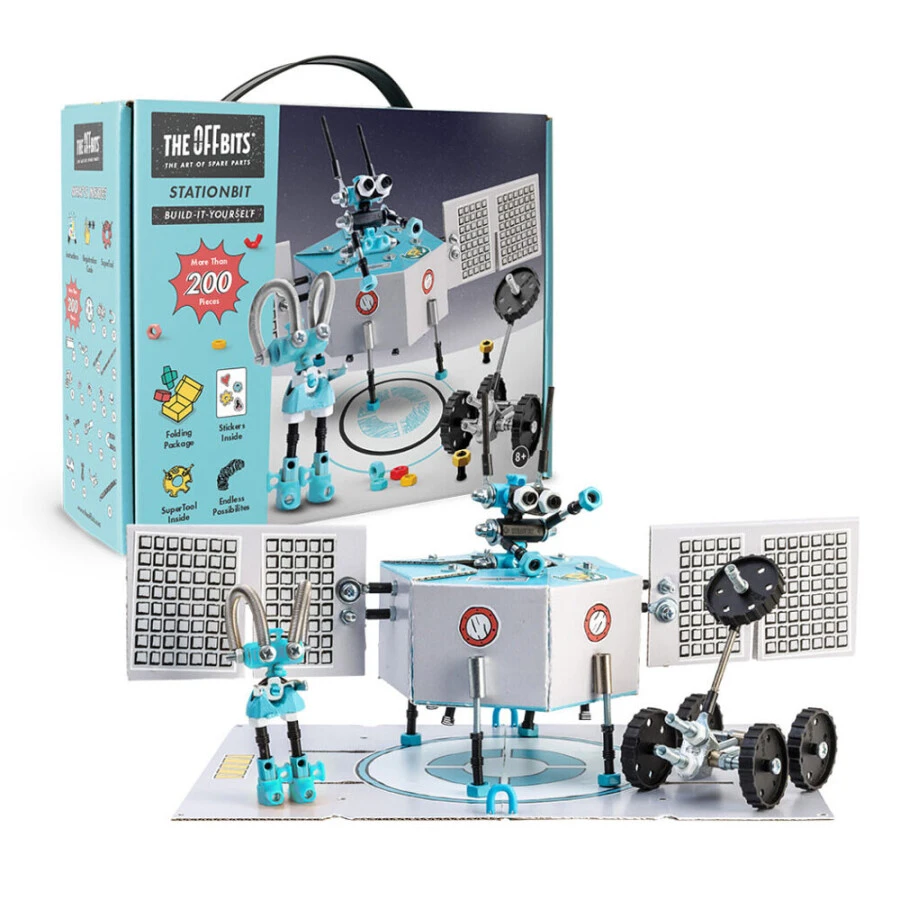 Zet een interstellair ruimtestation op! Verken planeten dichtbij en ver weg met deze mooie Offbits-Ruimtestation kit. Deze set heeft meer dan 200 kleurrijke moeren, bouten, gevormde bits, stickers en onze ‘zero waste’ multifunctionele verpakking die deel uit maakt van de speelervaring om een ruimtemodule te worden.