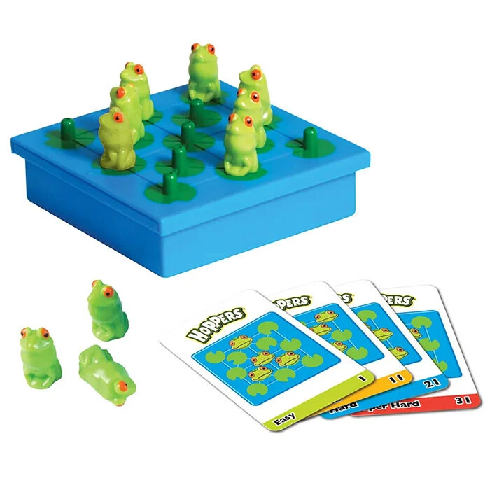 Hoppers bevat 40 opdrachten van beginner tot expert. Op de achterzijde van ieder kaartje staat eventueel de oplossing.