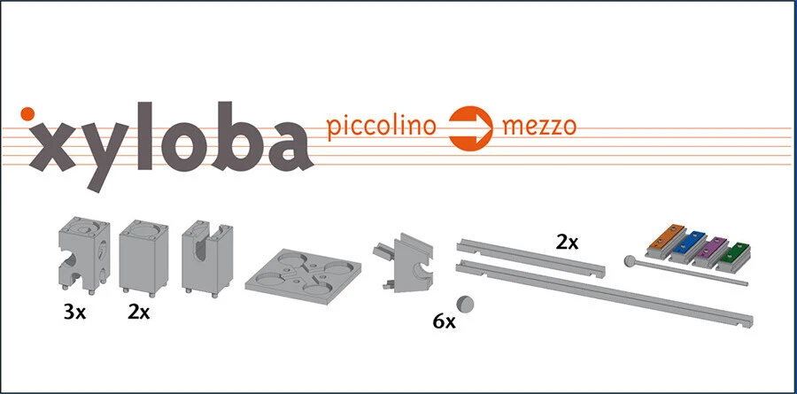 Een goede introductie in de wereld van de Xyloba knikkerbanen zijn de basissets Piccolino, Mezzo en Orchestra. De inbegrepen bouwelementen en klankdelen bieden heel wat mogelijkheden om een knikkerbaan te bouwen en een melodie te componeren.